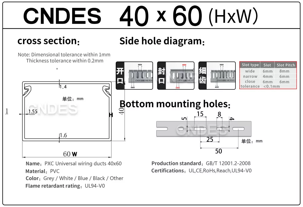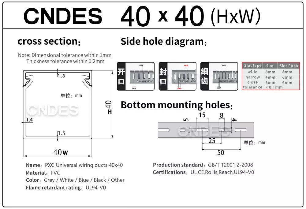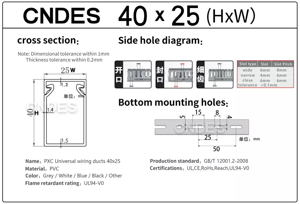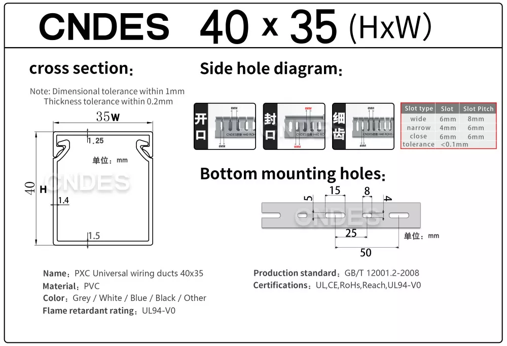 Ang CNDES ay Nangunguna sa mga tagagawa at supplier ng Slotted PVC Wiring Raceway Duct. Dito namin ipapakilala ang aming 40mm-height na mga cable tray, kabilang ang 40*25, 40*30, 40*35, 40*40, at 40*60.