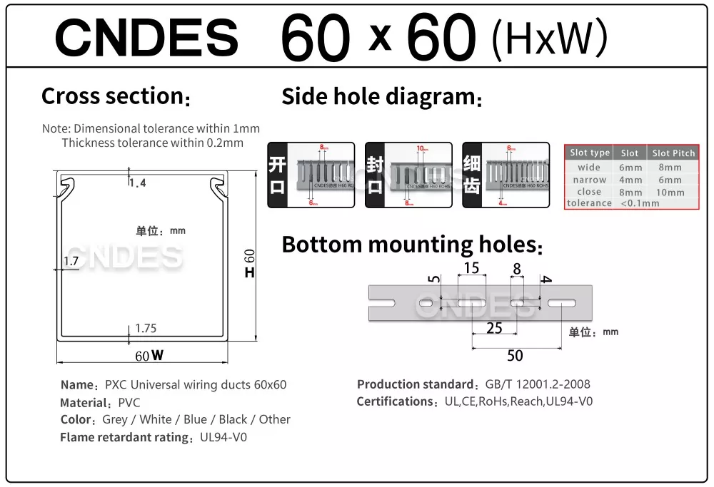 Ang 60×60 PVC Control Cabinet Cable Duct ay isang compact ngunit may mataas na kapasidad na solusyon sa pamamahala ng mga kable na idinisenyo para sa mga modernong electrical control cabinet, automation panel, at industrial enclosure. Ginawa ng CNDES, isang propesyonal na PVC wiring duct manufacturer at supplier sa China, ang duct na ito ay nagbibigay ng malinis na cable routing, maaasahang insulation, at pangmatagalang tibay para sa mga high-standard na control system.
