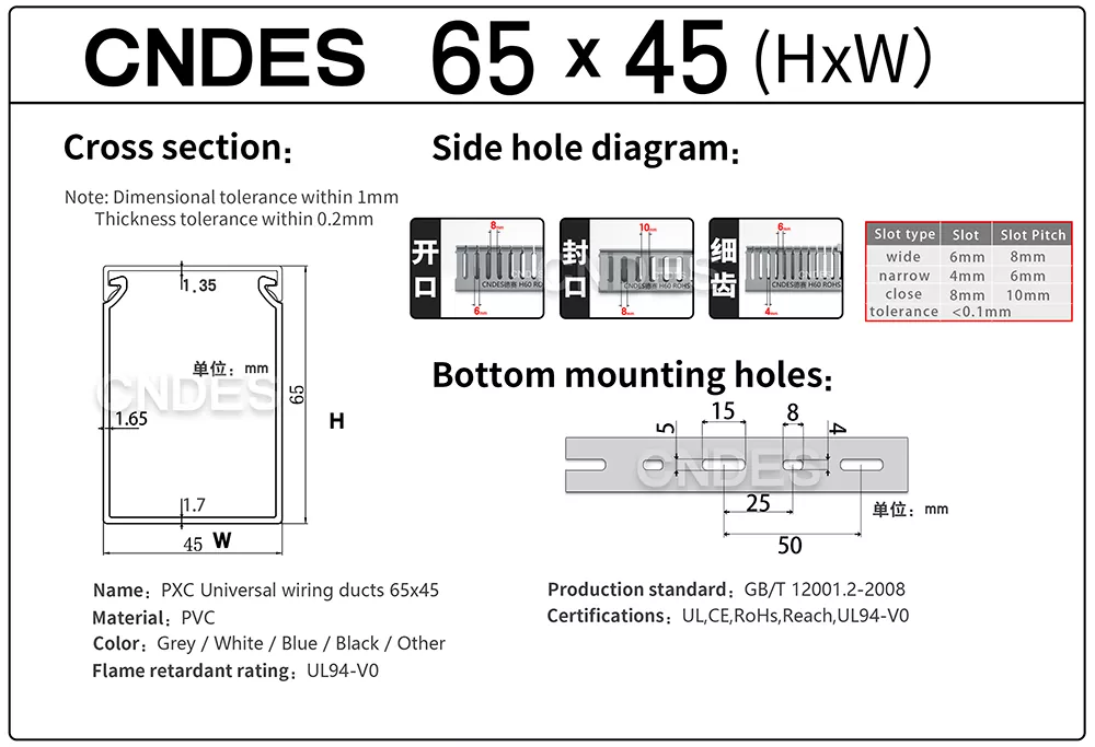 Kung ikaw ay kumukuha ng Customized 65×45 Gray Slotted PVC Wiring Ducts mula sa isang maaasahang manufacturer at supplier sa China, nag-aalok ang CNDES ng pare-parehong kalidad, flexible na pag-customize, at propesyonal na serbisyo.