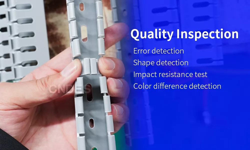 Ang mataas na pamantayang kalidad ng inspeksyon ay mahalaga sa pagbibigay ng magagandang produkto. Sa CNDES, ang aming paghahanap ng kalidad ay walang katapusan. Kami ay walang pagsisikap na magbigay sa aming mga customer ng maaasahang mga produkto. Mayroon kaming apat na inspektor ng kalidad na nagtatrabaho sa mga shift upang magsagawa ng online na inspeksyon ng aming mga produkto. Tinitiyak nito na ang aming Quality 80 Height Slotted PVC Automation Cable Ducts ay parisukat sa hugis, may makinis na mga ibabaw, nakakatugon sa mga katanggap-tanggap na pamantayan ng tigas,